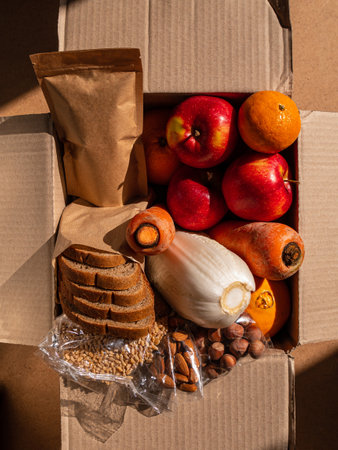 Healthy food delivery flat lay harsh shadows. Take away natural organic products package. Donation box New normal online shopping safe delivery concept. Fruits vegetables carrot apple grains bread nut