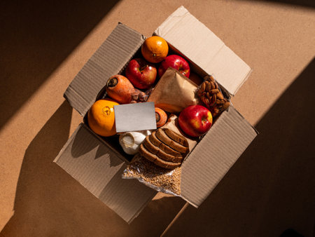 Healthy food delivery flat lay harsh shadows card mockup. Take away natural organic products package. Donation box New normal online shopping safe delivery concept. Fruits vegetables grains bread nuts