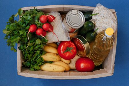 Top view on a cardboard box with products. Bananas, lemons, apples, pasta, oatmeal, rice, basil, sunflower oil and canned food. Food donation