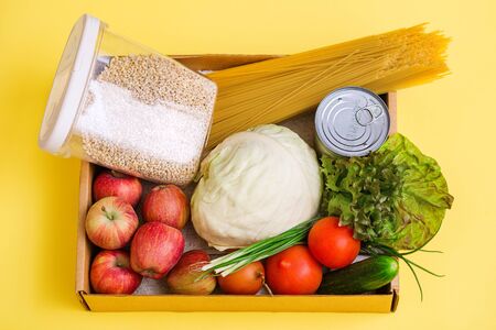 food for donation in a box, yellow background, place of copy, donation box, toilet paper and food products, volunteering and self-isolation help, contactless delivery concept,