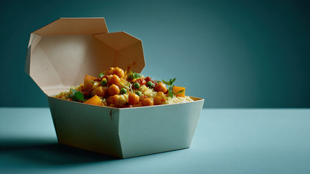Delicious vegetarian couscous bowl in takeout container