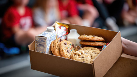 A delightful assortment of cookies is presented in a cardboard box, accompanied by milk and other snacks, set against a backdrop of engaged children at a school event.