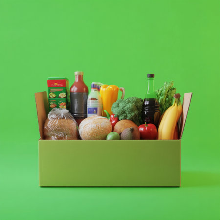 Assorted groceries in green box on vibrant green background.