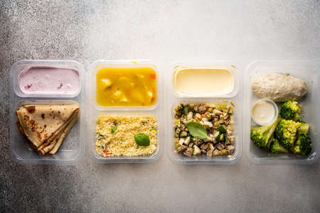 Weight loss diet balanced with fresh organic meal by delivery service of containers with healthy food, daily lunch box ready menu plan concept. Flat lay top view.