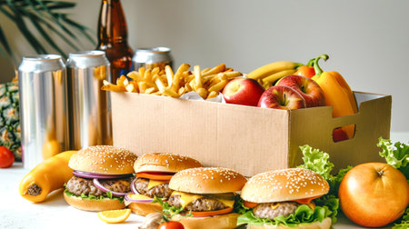 A delightful spread of burgers, fries, fruits, and refreshing drinks awaits to be enjoyed in a casual gathering.
