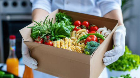 Close up of hands holding a food box with ingredients in a blurred kitchen for wallpaper use