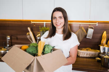 Home food delivery. Young smiling woman is sorting out a box with various vegetables, fruits and other products on the kitchen table which the courier delivered to her home