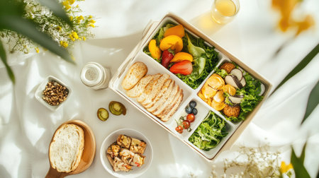 Freshly prepared lunch box with healthy snacks arranged aesthetically on a white table.