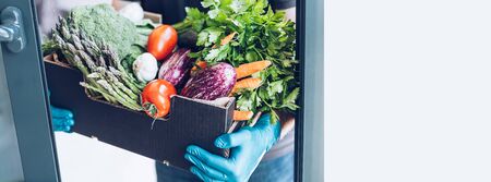 Fresh organic greens and vegetables delivery during coronavirus Covid-19 pandemic outbreak. Man hands wearing blue latex medical gloves holding box with safe grocery delivering in the house doorway