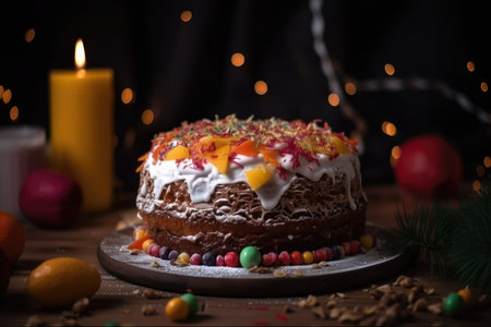 fruit cake topped with frosting and sprinkles for festive celebration, created with generative ai