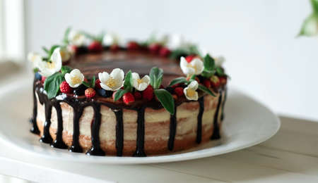Cake with chocolate, decorated with strawberries, jasmine flowers and honeysuckle on white wooden table on big plate