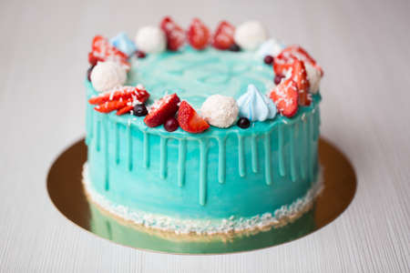 Cake turquoise and blue with strawberries, meringue and candies.