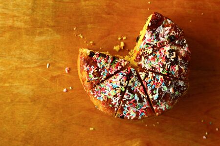Close-Up Photography of a perfectly round Confetti Cake against a bright multicolor background
