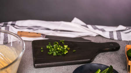 Step by step. Slicing jalapeno peppers for spicy jalapeno cornbread.