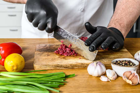 Man cutting raw beef meat. A chef in black gloves. Concept of cooking beef tartare.