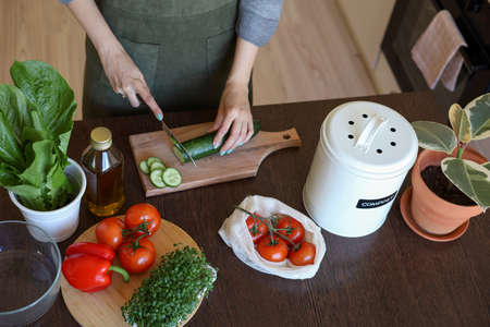 Young asian vegan woman cutting vegetables in the kitchen. Compost bucket. Eco friendly person. Vegetarian woman. Zero waste.