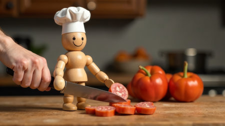 A wooden chef figure is cutting sausage on a wooden countertop. Fresh, ripe tomatoes rest nearby, and kitchen items are faintly visible in the background, showcasing a lively cooking atmosphere..
