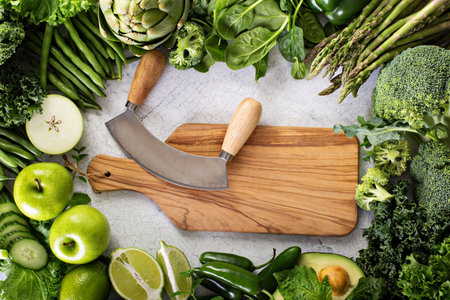 Variety of green vegetables and fruits copyspace with cutting board on white