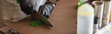 Close up of chef hands using professional knife to chop finely fresh organic herbs for recipe