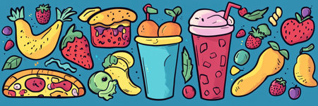 A vibrant fusion of playful doodles showcasing a variety of foods, including pizza, ice cream, fruits, and refreshing drinks.