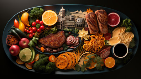 A visually appealing platter showcases a variety of fresh, healthy foods, including grilled fish, vegetables, fruits, and whole grains.