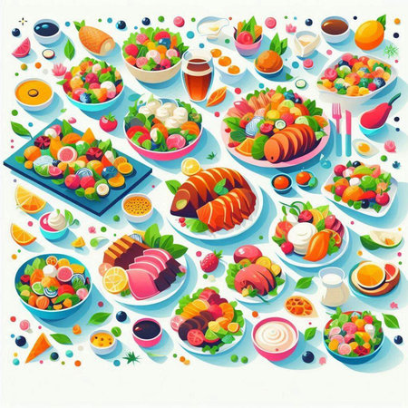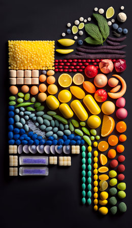 This vibrant abstract artwork bursts with color, showcasing a balanced diet of diverse food items The dynamic composition represents the power of nourishing your body with essential nutrients to boost metabolism and promote overall health Each splash of color highlights the importance of a well-rounded dietary approach for optimal well-being AI Generative