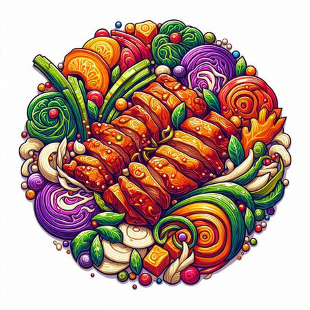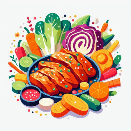 Illustration of grilled chicken and vegetables on white background. Vector illustration