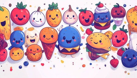 A whimsical illustration of anthropomorphic food items?fruits, vegetables, and sweets? smiling and arranged against a white background with colorful splatters. They include blueberries, tomatoes, ice cream, and burgers