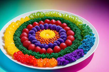 Top down, blurred out view of a rectangular arrangement of colorful produce (berries, bananas, oranges, grapes, broccoli, and beetroot) on a white table, representing the rainbow as a metaphor for hea. Generative AI