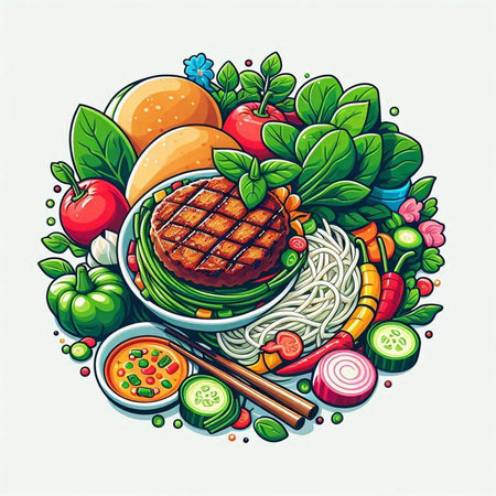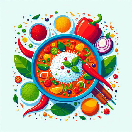 Illustration of Thai food with rice, chili pepper, tomato, cucumber, onion, bell pepper and garlic