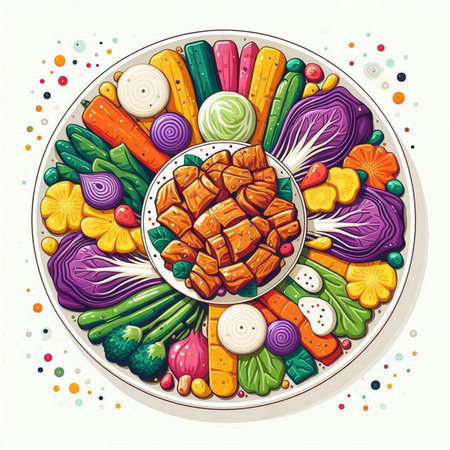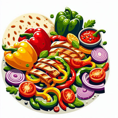 Illustration of a plate with grilled meat, vegetables and cheese.
