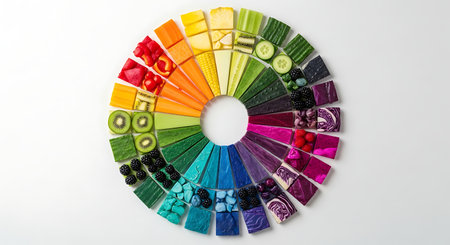 A vibrant and colorful display of fresh fruits and vegetables arranged in a rainbow spectrum. This visually appealing assortment highlights natural textures and the beauty of healthy foods.