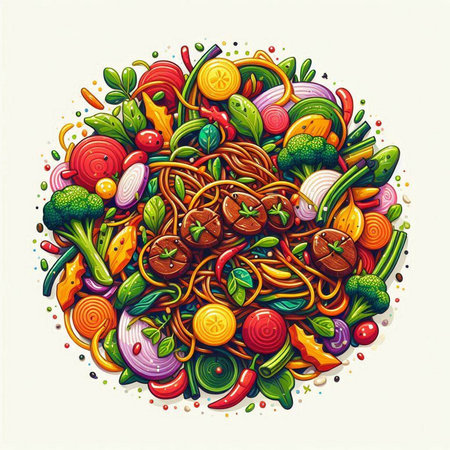A creative digital illustration depicting High-quality creative of abstract food explosion, dynamic motion blur, vibrant colors, artistic appeal. This AI-generated artwork features unique visual elements suitable for various commercial and editorial applications. AI-generated illustration.