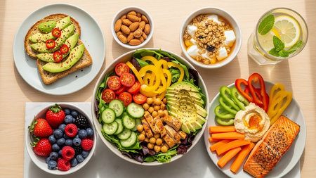 An overhead shot showcases a diverse array of healthy food items. It features a colorful salad, fresh berries, avocado, and a refreshing drink on a wooden table. The scene is illuminated by natural light, casting soft shadows. This image could be utilized for various commercial purposes, including health, wellness, and lifestyle content.