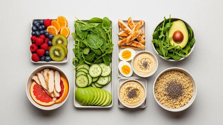 Healthy fitness meal with lean proteins, whole grains, and superfoods, top-down composition on a stylish minimalist paper background. Generative AI