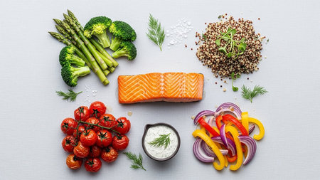 A flat lay of healthy ingredients including salmon fillets, avocado, cherry tomatoes, quinoa, spinach, and hummus arranged on a light surface.