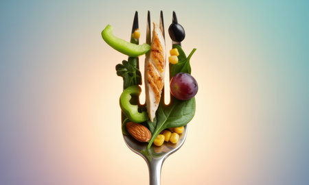 Grilled chicken, green pepper, spinach, corn, almond, olive, and grape artfully presented on a fork, symbolizing healthy eating and balanced nutrition.