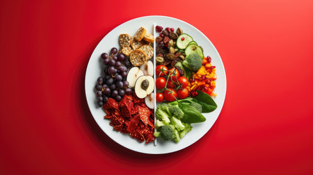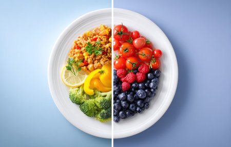 A top-down view showcases a plate divided, filled with varied fresh produce. One side highlights cooked grains with vegetables and lemon. The other section displays tomatoes, raspberries, and blueberries. Composed against a gradient background, it suggests a balanced diet, suitable for health and wellness related projects.