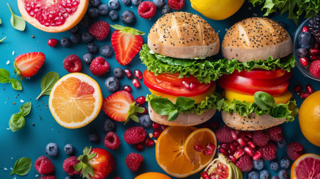 Healthy food concept. Top view of hamburgers with fresh fruits and vegetables on blue background