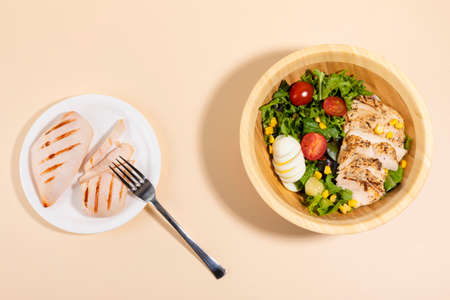 boiled chicken breast and chicken breast salad, white background