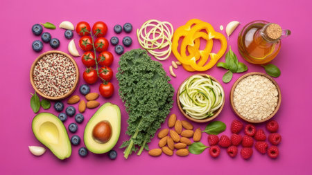 An overhead view presents a vibrant array of fresh produce. Items include tomatoes, peppers, berries, avocado, and grains. The composition features a bright, flat lay style, with a pink background. This image is suitable for health, wellness, and culinary content, and can be used in various commercial applications.