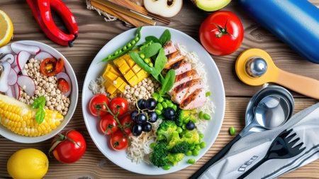 A vibrant and balanced meal showcasing grilled chicken, a variety of colorful vegetables, and fresh fruits arranged on a rustic wooden table. Perfect for promoting healthy eating and an active lifestyle.
