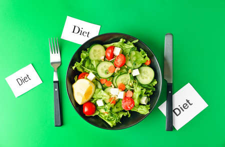 Paper sheets with word DIET and plate of delicious fresh salad with vegetables and feta cheese on color background