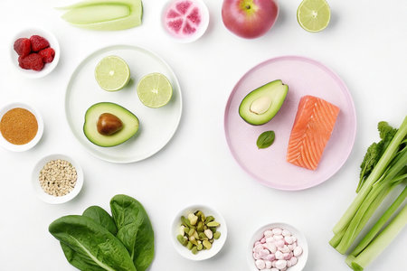 Flat lay of healthy food ingredients salmon, avocado, lime, apple, berries, spinach, celery, seeds, and spices.