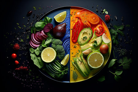 Vibrant and nutritious assortment of fresh fruits and vegetables on dark solid background