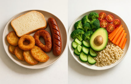 Unhealthy fast food plate with sausage, onion rings and white bread compared to healthy balanced meal with vegetables and grains. Concept of nutrition choice, healthy eating, diet comparison.
