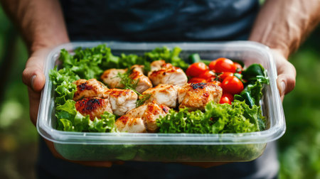 Fitness Meal with Chicken and Veggies Held by Fit Man