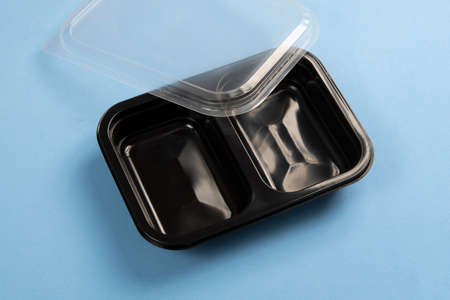 Black plastic container for food delivery service in a blue background