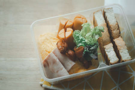 Healthy breakfast with omelet, toast, sausage and vegetable in box. Breakfast set box