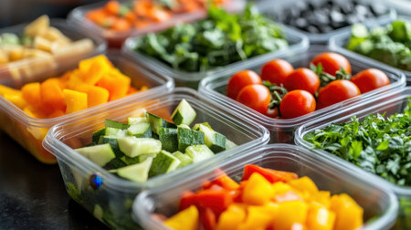 A vibrant array of freshly chopped vegetables in clear containers, showcasing a variety of colors and textures ideal for meal preparation and healthy cooking.